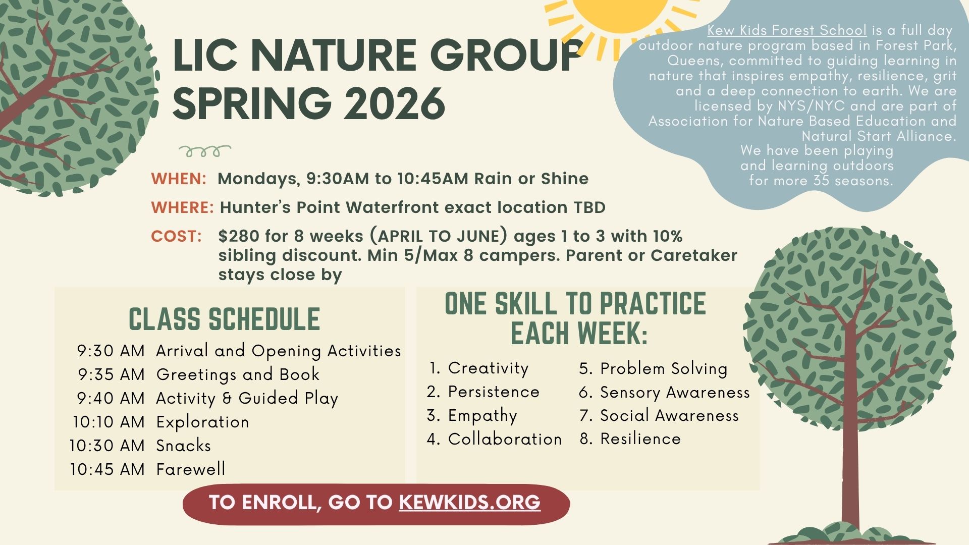 Kew Kids is the only forest school in Queens and the only one in New York City to offer a half day and full day all-weather, year-round forest program for young children. We are a mixed-age nurturing community of outdoor learners that value kindness, cooperation, curiosity, imagination, and respect for all living things. Here in the city where forest area is sparse, we are lucky to trek in Forest Park, the third largest park in Queens covering an area of 538 acres and containing 165 acres of trees. Numerous trails wind through native hardwood (oak-hickory) forest and canopies. Forest Park is our classroom, and Kew Kids use the landscape, the hills, the edges, the trees to encourage exploration, experimentation and development.